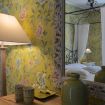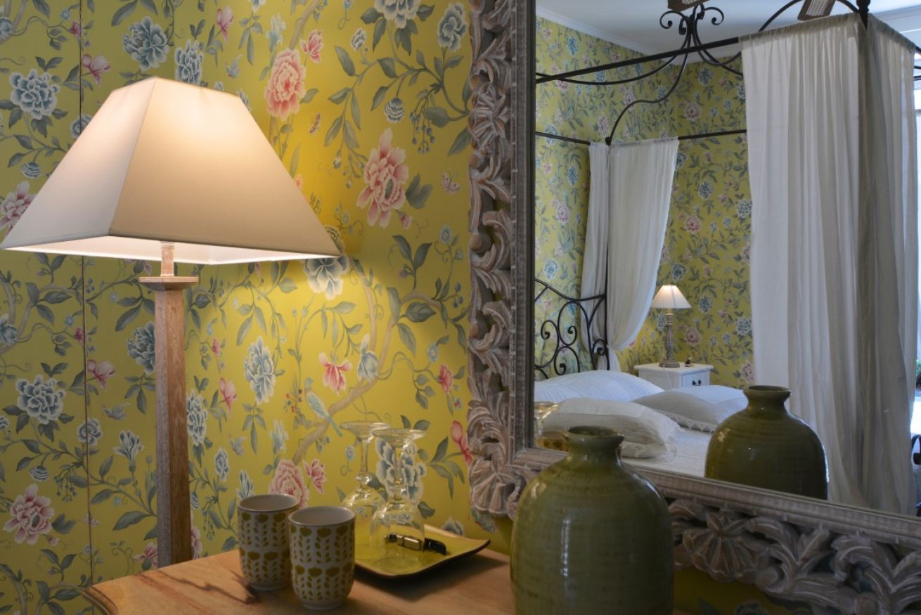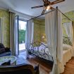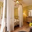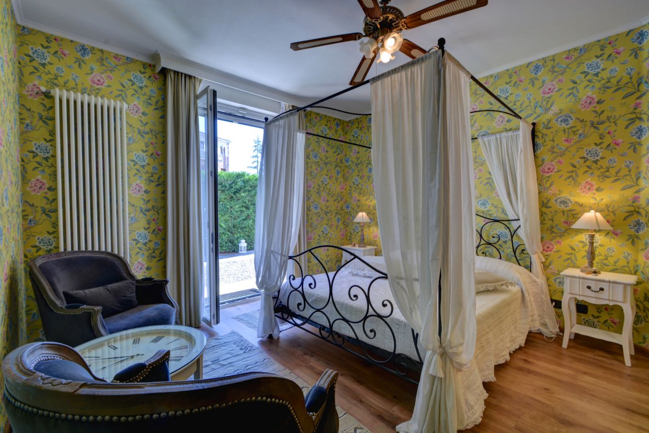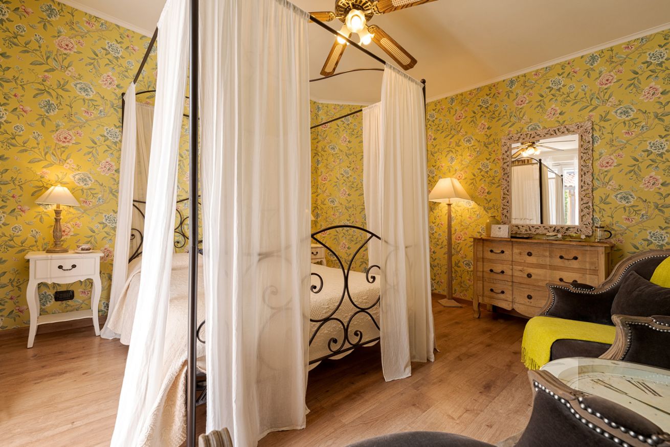 La camera Peonia vi accoglie con il suo romantico letto a baldacchino.
