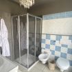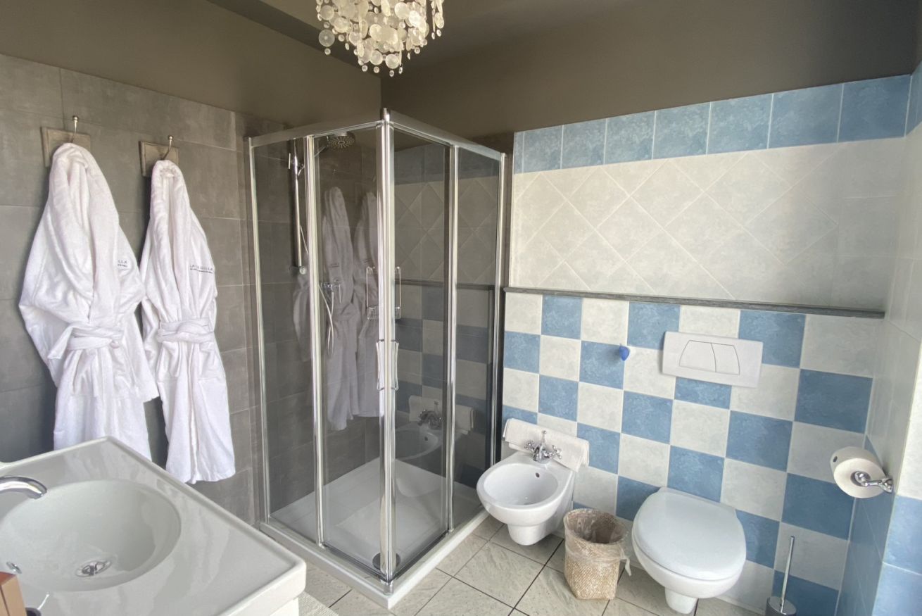 Un grande specchio sulla madia in legno chiaro dona luce e armonia all'ambiente. L'ampio bagno privato con doccia sui toni del blu dispone di asciugacapelli, morbidi teli doccia e viso, e prodotti di cortesia della linea all'Argan.