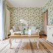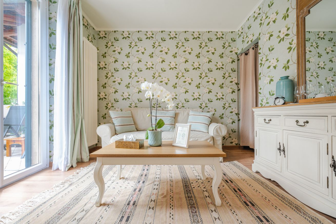 At the entrance a majestic mirror shines the floral wallpaper in shades of blue; the large living room where you can relax is completed by a comfortable sofa and coffee table.
